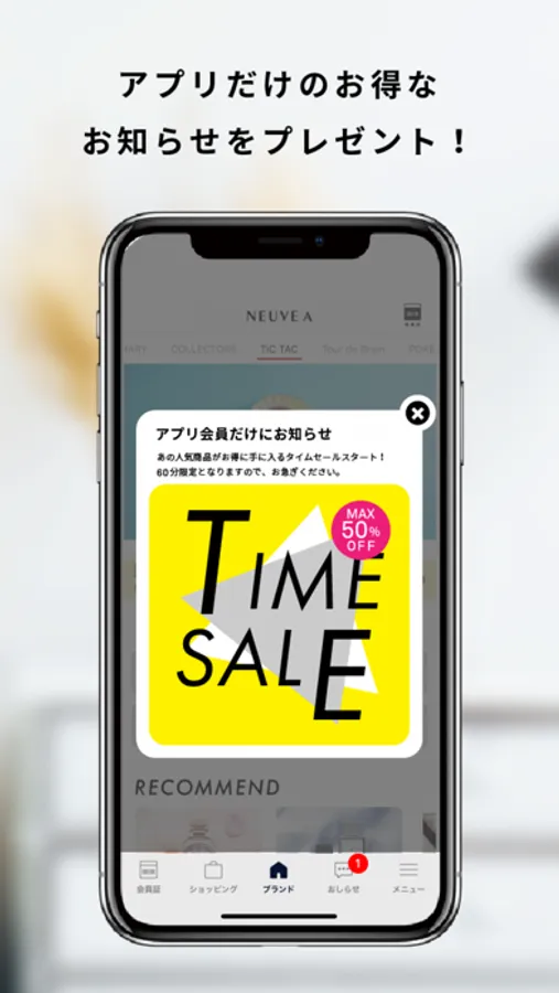 アプリ限定のおトクな情報各ブランドのトピックスをプッシュ通知で配信します。