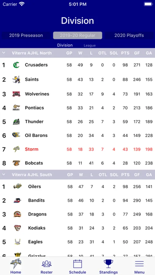 • Standings by Division, Conference and League