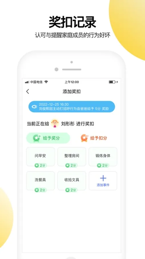 【添加奖分】点击需要奖分的事件系统自动加分。例如:主动做家务+5分;洗手+1分;吃水果+3分;练习钢琴+10分;阅读绘本+10分等;