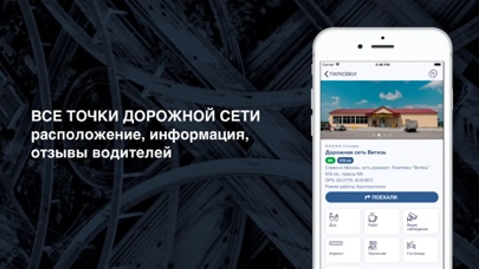 У каждой парковки, шиномонтажа или мойки указаны: трасса, километр, адрес, ориентир, GPS-координаты, перечень услуг, а также рейтинг и отзывы водителей, которые посещали эту точку. Вы сами можете оставлять отзывы и назначать рейтинг точкам после посещения.
