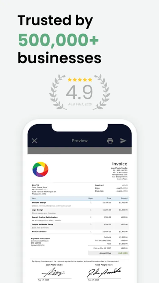 Trusted by over 800,000 small business owners and freelancers in 150 different countries, it is the best FREE invoice maker app that sends professional invoices and estimates to customers.