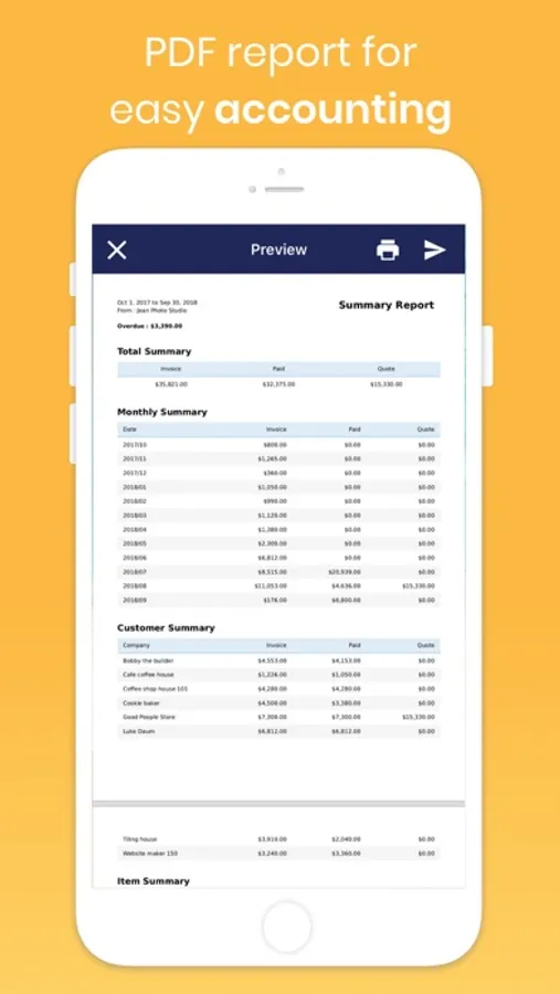 PDF reports can be generated for invoices, estimates and payment summaries. These can be organized by month, customer or item for convenient accounting and bookkeeping.