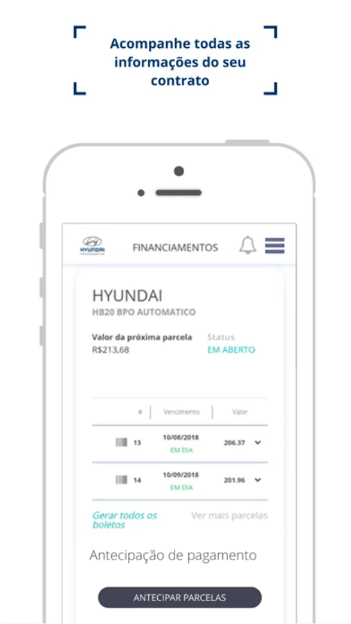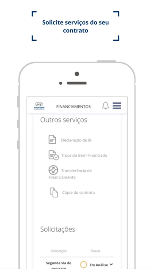 O aplicativo Hyundai Financiamentos é o seu canal de atendimento digital na palma da mão, onde e quando você quiser. Nele, você poderá obter os seguintes serviços: