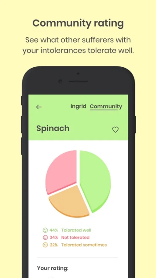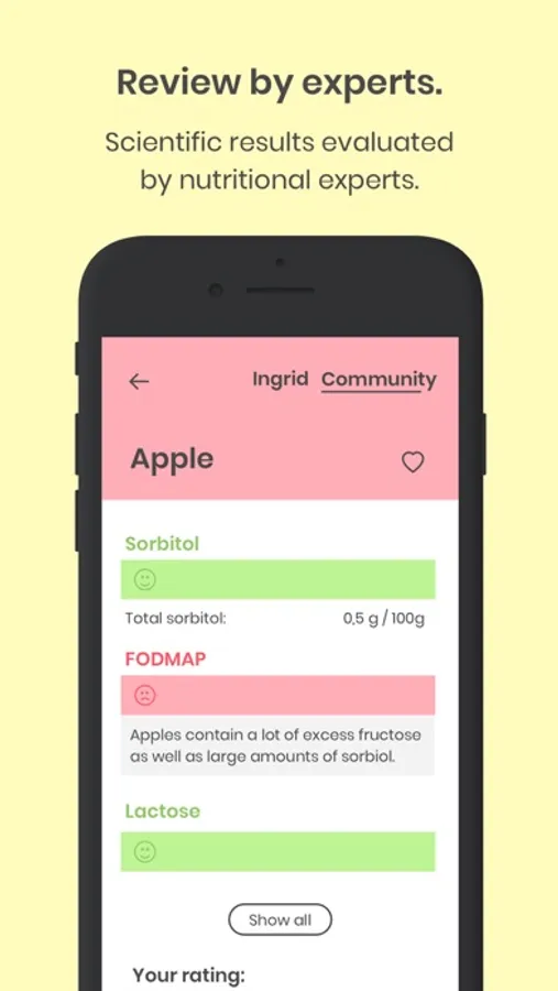 Download the free app and adjust your personal intolerances. Ingrid shows you all the important information. Her information is based on scientific findings and the food ratings are developed in collaboration with the experts of the Austrian charity “Society for Public Health”. Ingrid also shows you how well individual foods are tolerated by other people. So the community results let you see, how other patients tolerated that foods.