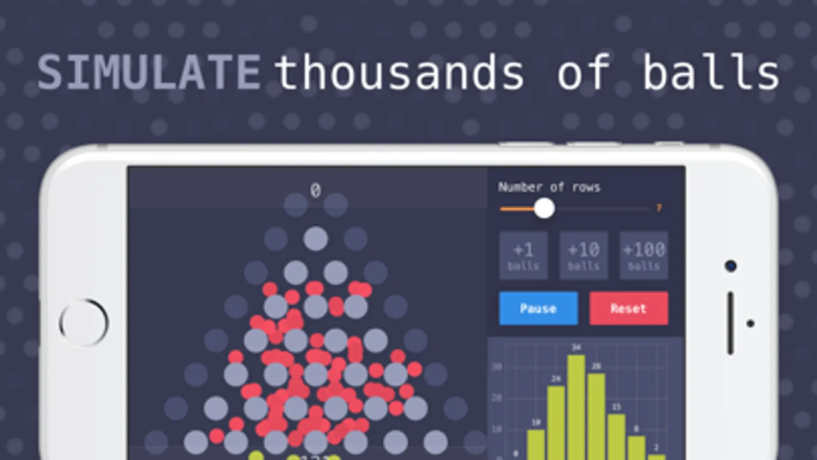 This app is a simulation of the famous Galton board and is intended for educational purposes. You can adjust the board size, and send over a thousand balls bouncing down the board. On iPad you can even run multiple simulations simultaneously with multiple windows.