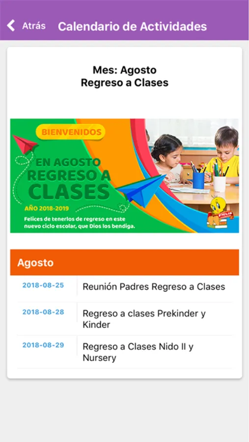 Aplicación del Preescolar Piolin, dirigida a los padres Piolin, con la finalidad de mantenerlos informados de las actividades escolares del año.