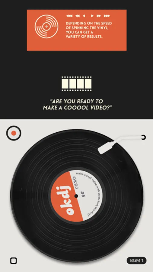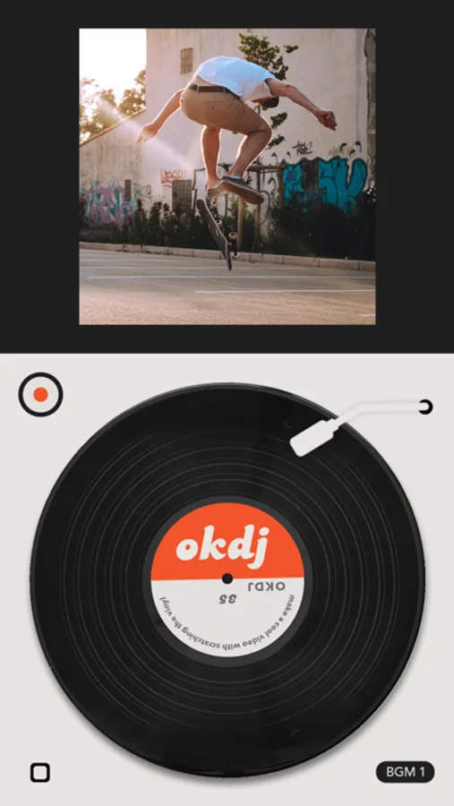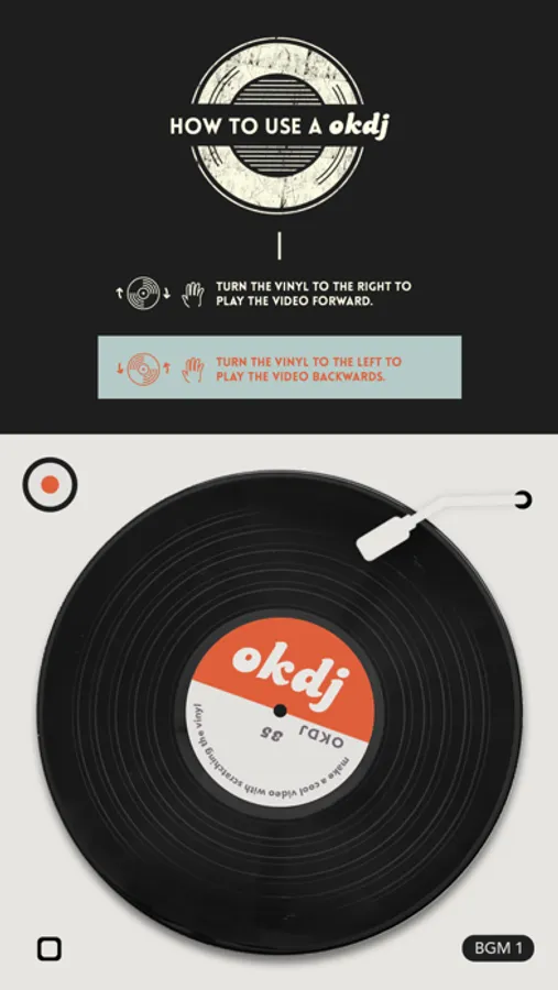 Like a DJ scratching a vinyl, OKDJ allows you to edit your videos by turning the vinyl. Load one of your videos first. Hit the record button. Control the vinyl along with music.