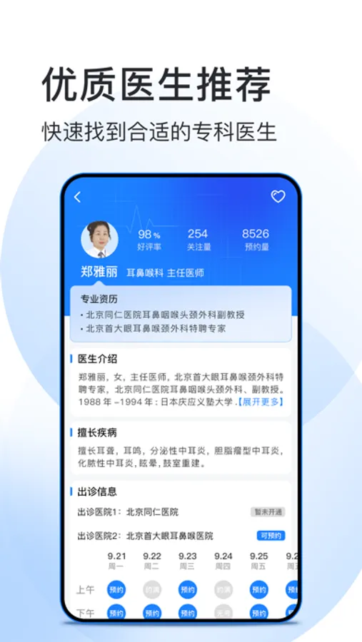 平台以医生头衔、医生擅长、用户评分等信息简单直观的展现了医生介绍,便于用户选择最适合自己的医生。