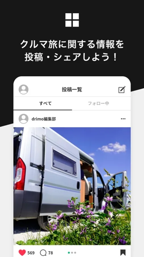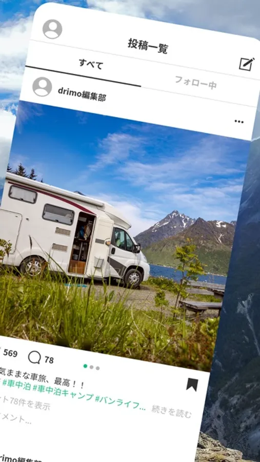 車旅の様子やおすすめスポット、旅の思い出、自慢の車、車旅快適化の工夫やDIY方法など、スマホで撮影して気軽に投稿!