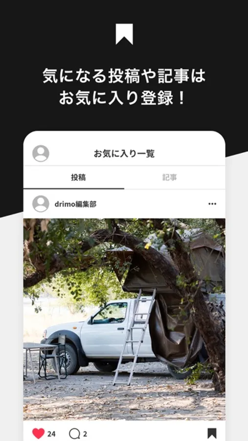 いつか行ってみたいスポットや、参考になった車中泊スタイル&DIY方法など、DRIMO配信記事やみんなのアイデアを気軽に保存できます。