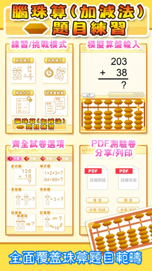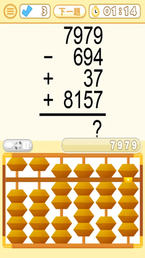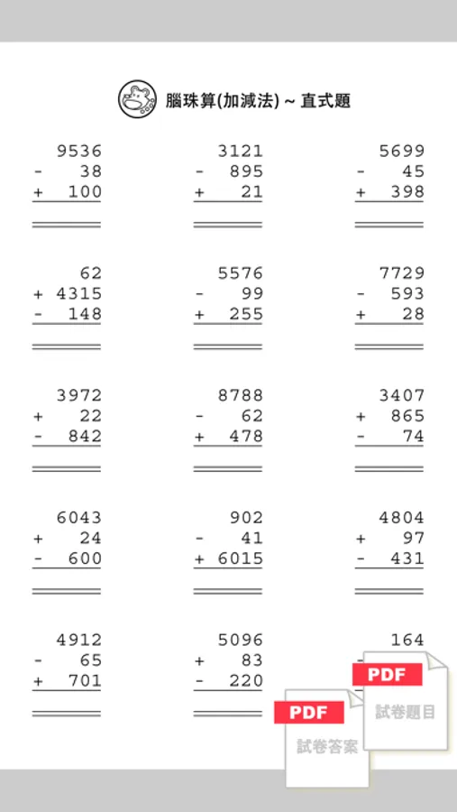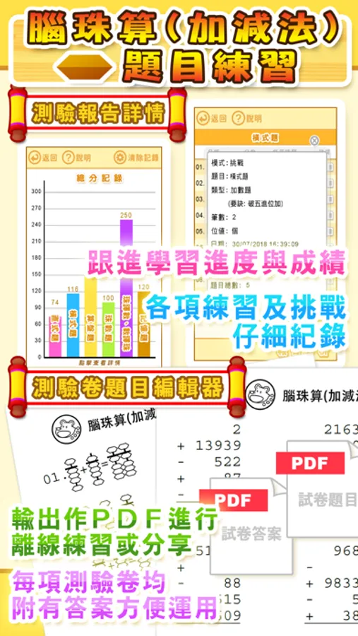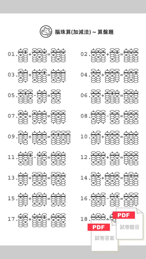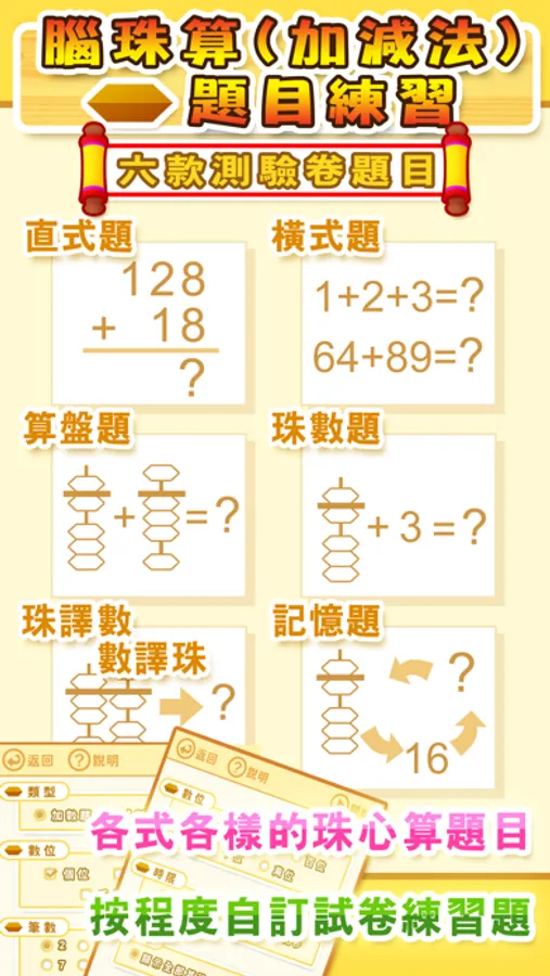 終極的珠心算加減數題目編輯器! 提供六款珠心算必備的題目訓練, 包括直式題、橫式題、算數題、珠算題、珠數互譯、記憶題。