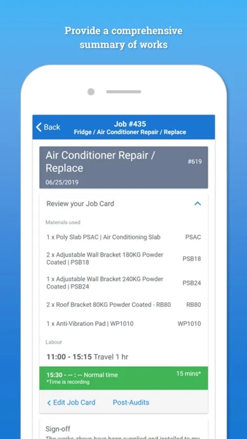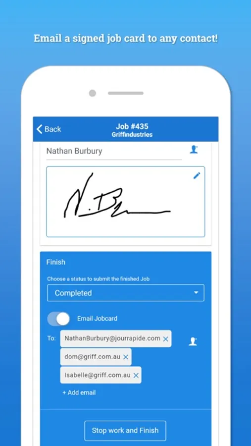 * Capture staff and customer signatures and email a signed job card directly to any contact