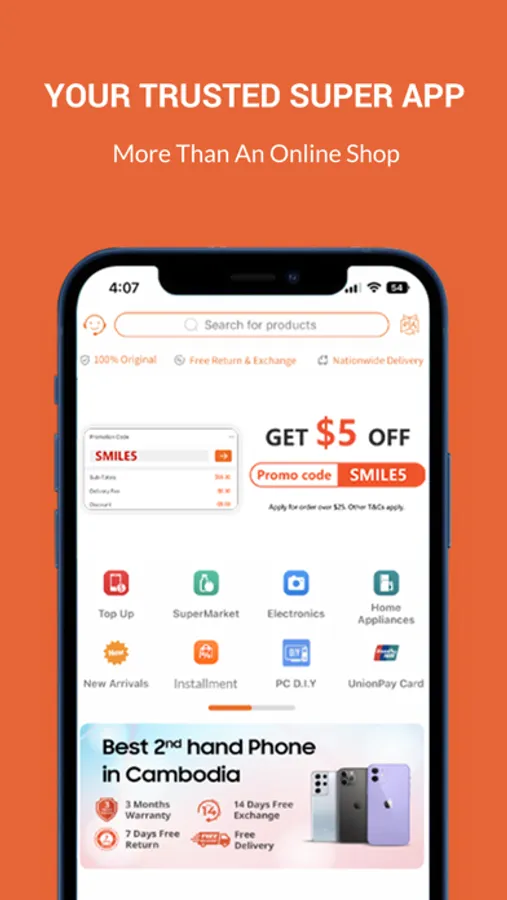 Smile Shop provides you the best online shopping experience with the highest quality customer service, a comfortable and functional App, a fast delivery service (24 Hours), a safe online payment methods (Visa, Master, Union Pay, Wing, ABA, Chip Mong Pay, Aeon card, PiPay, WeChat Pay, Alipay, and HUIONE Pay) and an official merchant warranty.