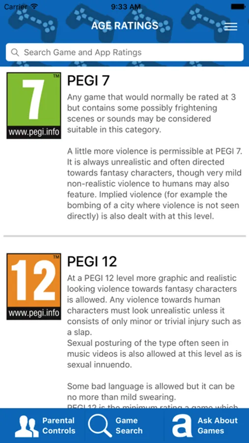 Check out the latest video game and app classifications from PEGI to help you and your family decide if a game is right for you. Easily search for video game and app rating information and read up on parental controls for your devices at home or on the move.
