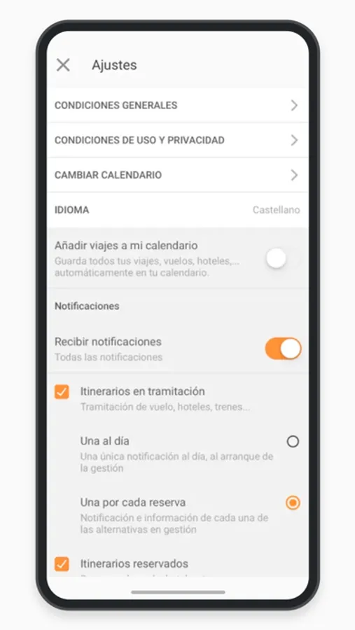 - Configurar las notificaciones que te interesan para estar puntualmente informado de tu viaje: viaje en tramitación, billetes reservados y confirmados, cambios, cancelaciones y/o aviso de check-in.