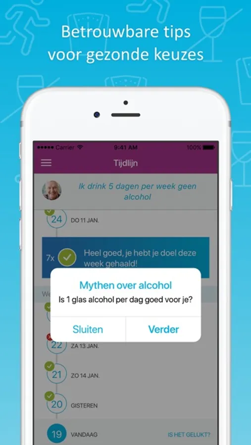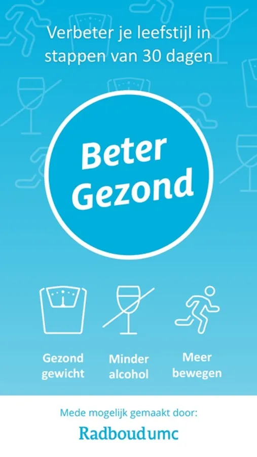 De Beter Gezond App helpt om gezondere gewoontes te gaan vormen. Door meer te bewegen – of het nu sporten is, of altijd de trap nemen in plaats van de lift, geen of minder alcohol te drinken, en gezonder en minder calorierijk te eten. Stoppen met roken wordt niet in de app ondersteund, wel worden er tips gegeven voor het vinden van verantwoorde hulp bij stoppen met roken.