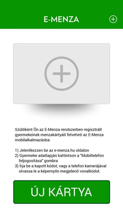 Az alkalmazás telepítése után az E-MENZA webes szülői adminisztrációs oldalon belépve a gyermek profiljában található "Mobiltelefon feljogosítása" gombra kattintva kódot kell kérni, melyet az alkalmazás "Új kártya" funkciójával le lehet olvasni (QR kód) a képernyőről (ez esetben a telefon kamerájának elérését engedélyezni kell az alkalmazásnak), vagy be lehet gépelni.