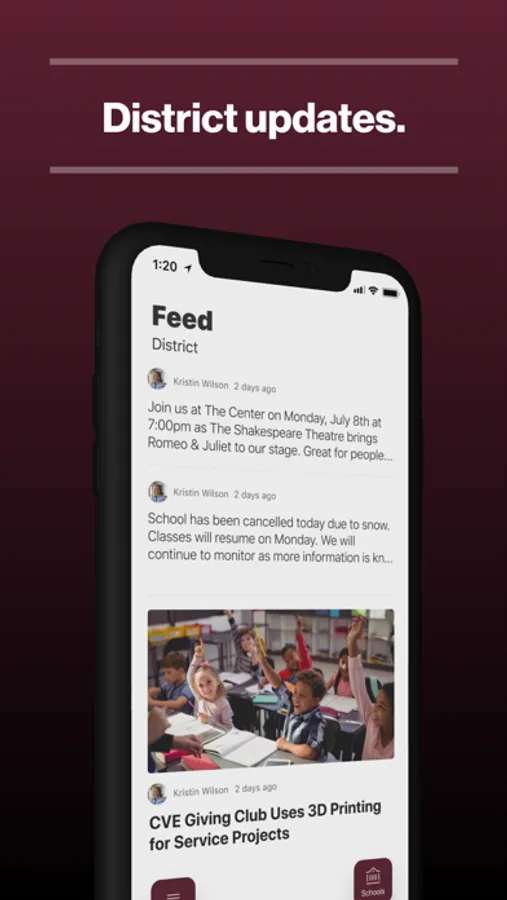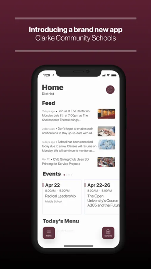 The official app for Clarke Community Schools, Iowa allows users direct access to the most recent news, announcements and event calendars. Customize the app to display information relevant to a specific campus and to receive important notifications from the district. Users may also access the directory of district faculty and staff, view dining menus, find the location of district events, contact campuses and departments, follow athletic scores and updates, and much more.