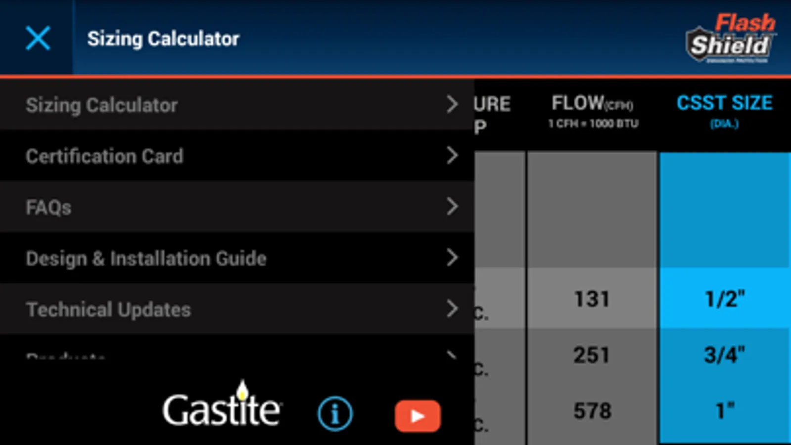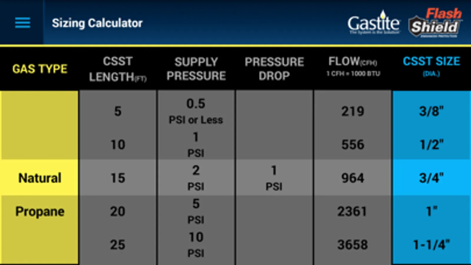 The Gastite and FlashShield flexible gas piping systems are designed and warranted to provide sufficient gas volume and pressure for proper appliance performance using the appropriate sizing tables and methods detailed in the Design and Installation Guide and this Mobile Sizing App.