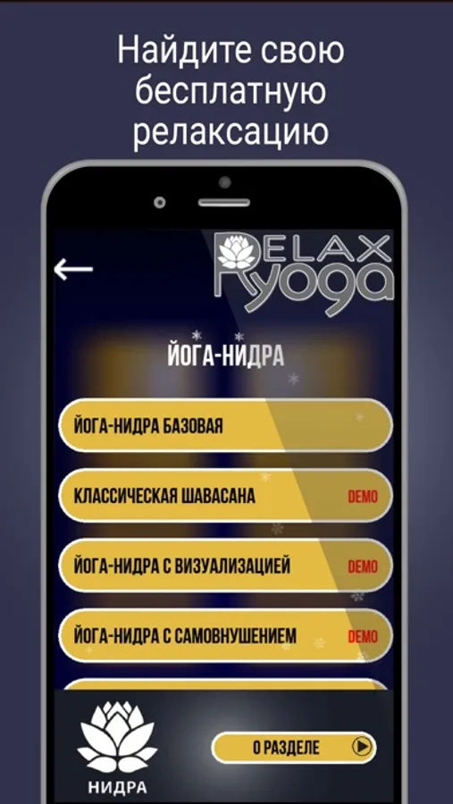 Приложение также содержит ДЕМОВЕРСИИ релаксаций (пометка DEMO) продолжительностью до 3 минут.