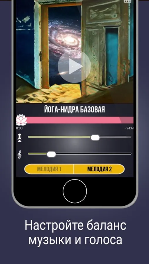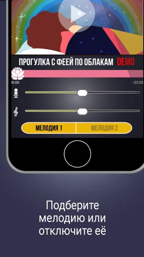 Вы можете прослушивать релаксации, как с музыкальным сопровождением, так и без него, с возможностью выбора мелодии и регулировкой громкости.