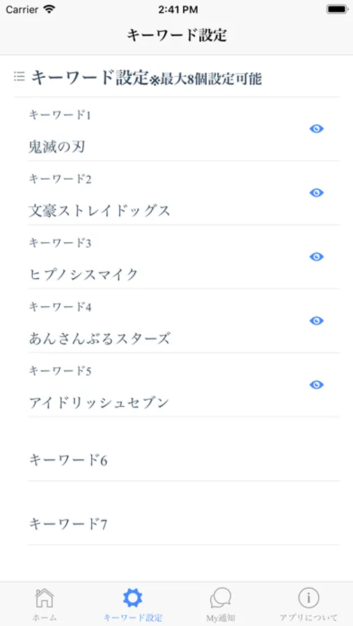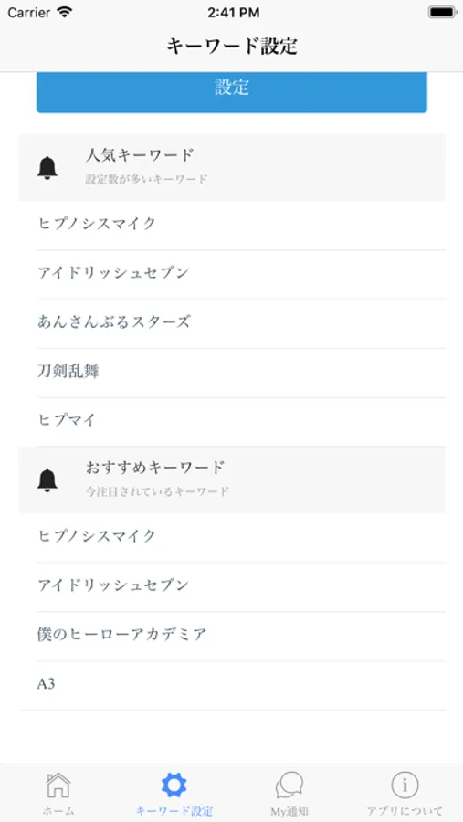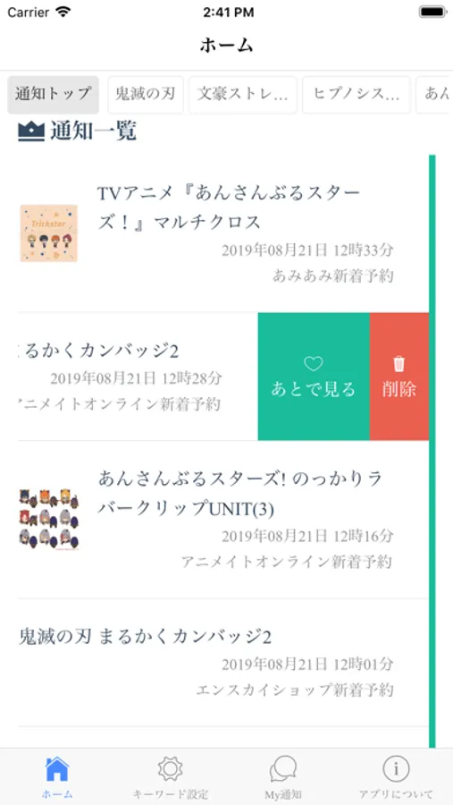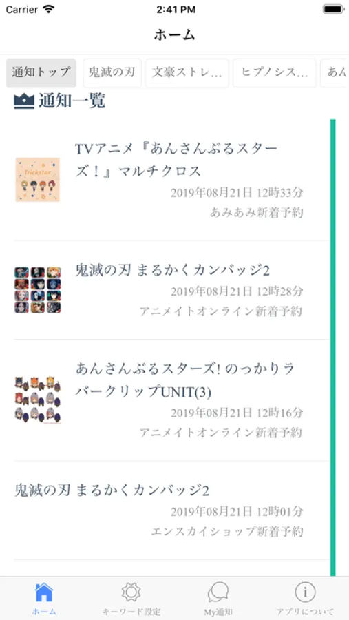 キーワード設定がアプリの特徴です。キーワードはアニメ名だけではなく、例えばキーホルダーが欲しい場合、「キーホルダー」と設定しておけば、キーホルダーの予約新着通知を受けることができます。「ヒプノシスマイク,キーホルダー」などと複数のワードを同時に設定することができるので、この場合、ヒプノシスマイクのキーホルダーが予約開始されると通知が届きます。このようにユーザー自身が自分に必要な情報だけ得ることができるのです。