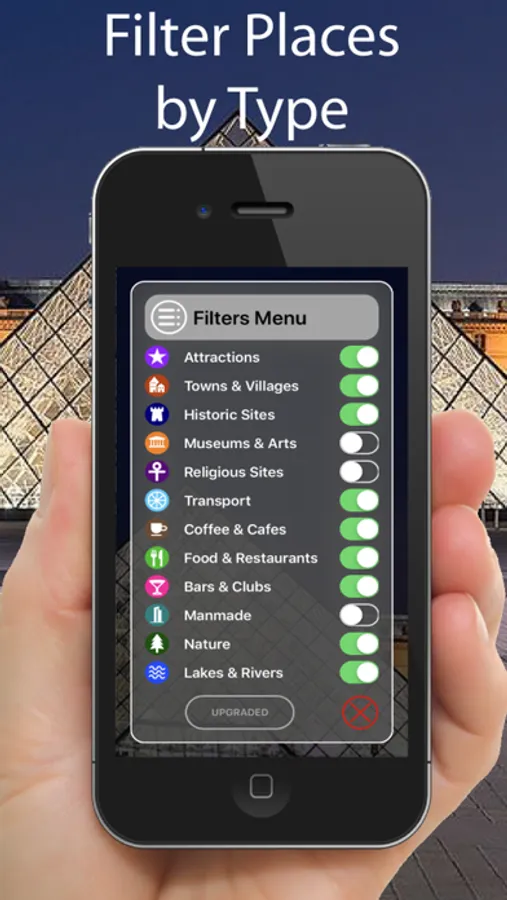 Categories that can be viewed and selected include Tourist Attractions, Hills, Lakes, Parks & Woodlands, Cities, Towns, Suburban Areas, Villages & Hamlets, Cafes, Restaurants, Cafes, Airports, Train & Major Bus Stations, Municipal Buildings, Places of Worship, Historic Sites and Museums & Arts.