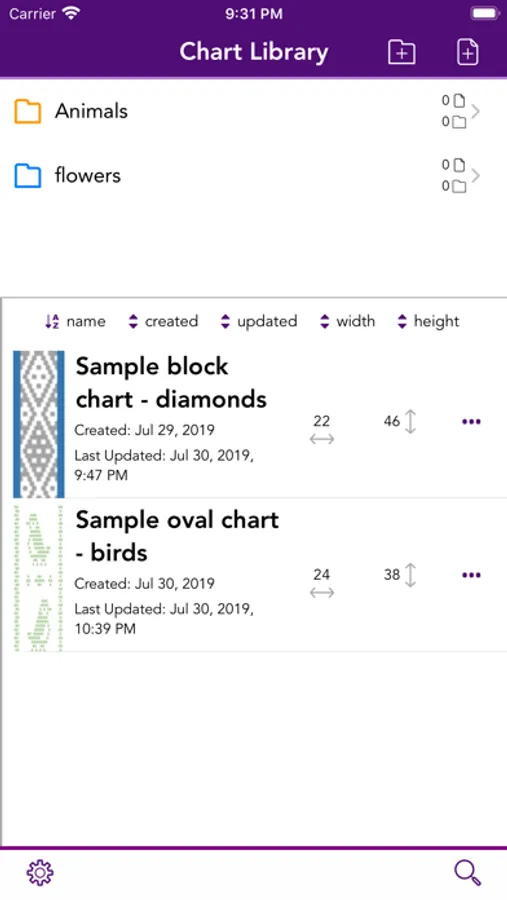 + Sort by name, width, height, created date, updated date, number of charts.