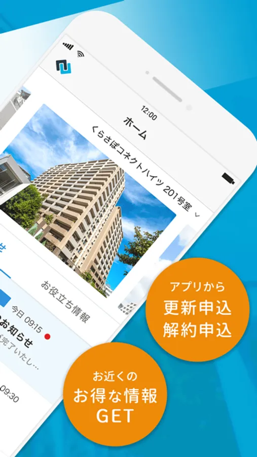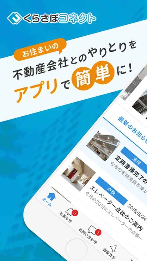 このアプリでは、お住まいの物件について不動産管理会社からのお知らせの受け取り、不動産管理会社へのお問い合わせなど、双方向のコミュニケーションが容易になります。その他にも、お住まいの物件の近隣でご利用出来るお得な情報の提供など、あなたの暮らしに役立つ情報を提供します。
