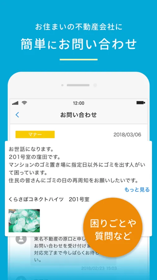 管理会社への問合せをアプリ上で行うことができます。カメラで写真も送信できます。