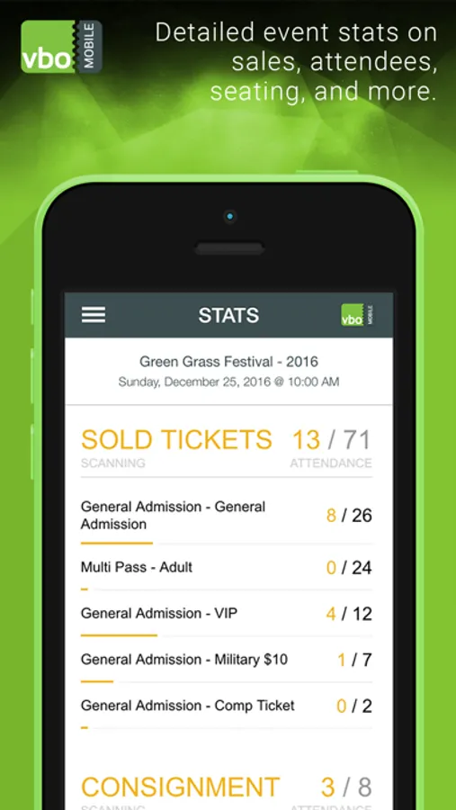 With Virtual Box Office’s VBO Mobile app, event producers are just a click away from real-time statistics, guest lists as well as check-in and check-out functionality.