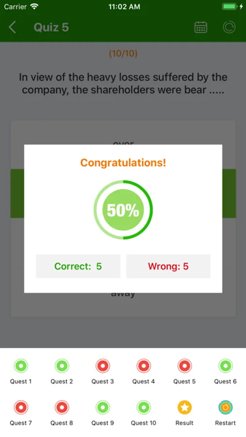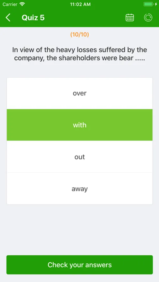 If you want to learn English Phrasal Verbs, we have Flashcards and Multiple choice Tests. After each Test, summary will be displayed indicating your marks and percentage.