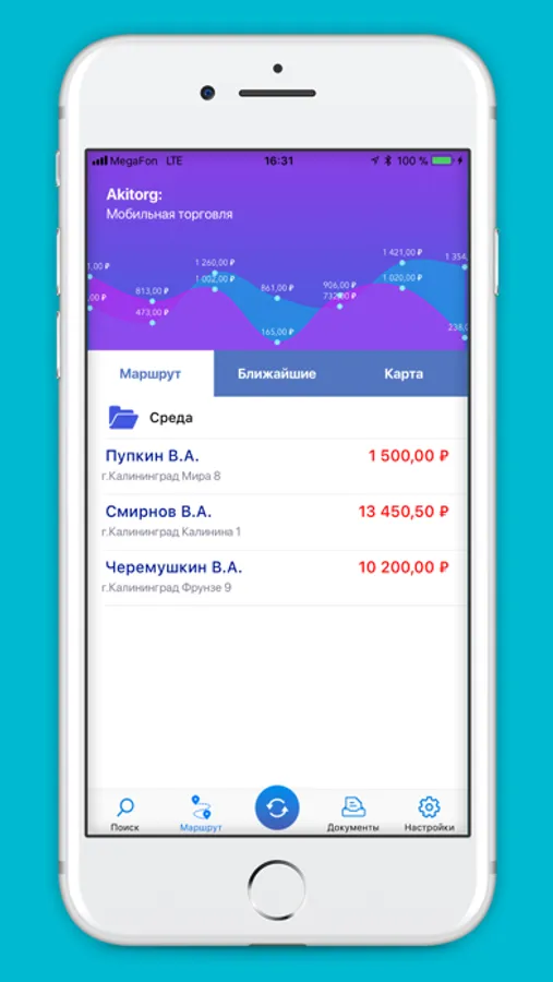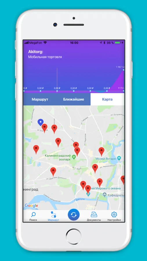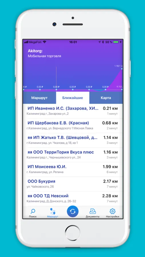 Оперативный доступ во время работы на маршруте Вашего мобильного торгового представителя ко всей необходимой информации по каждому клиенту: дебиторская задолженность, актуальные остатки товара на складе, цена товара, история продаж, сумма сделанного заказа, лимиты. Выгрузка заявки в офис в течение ОДНОЙ минуты!