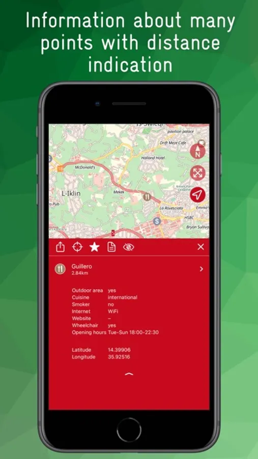 For many POIs there is further information such as opening hours, address, disabled access, ... Notes or favourites can be created for each POI, a history list shows the most recently used POIs, content can be shared.