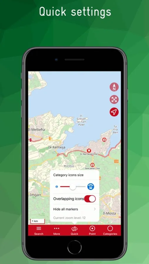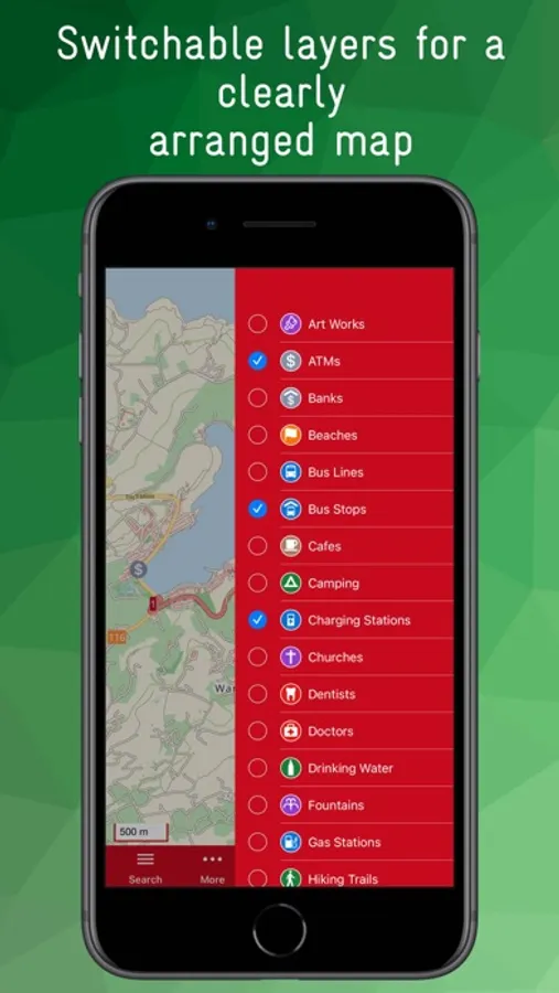 POIs are grouped into categories and can be displayed as layers. For example, you can display all restaurants, public transport lines, banks, hiking trails, charging stations and doctors on the map. The size and overlap of the icons can be adjusted to improve clarity.