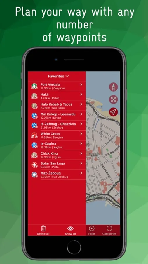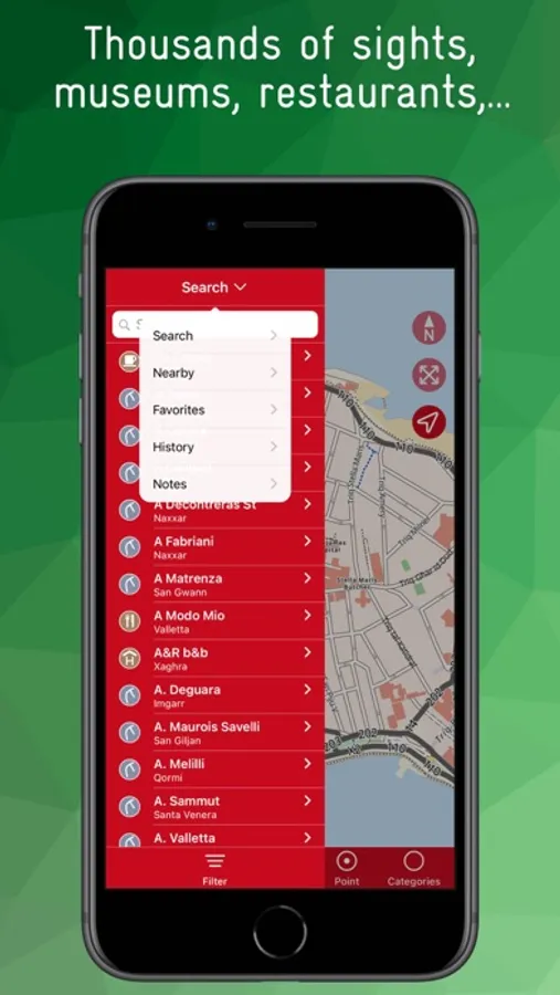 An integrated database allows you to search for POIs as well as a large number of streets, towns, villages, districts, etc. The search can be filtered by category and/or distance.