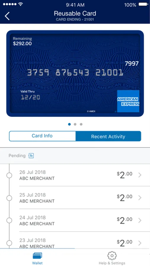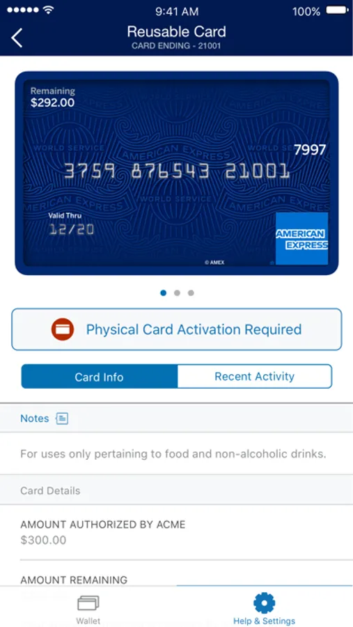Pay for business purchases anywhere American Express® Cards are accepted—up to the amount authorized and within policy. (Contact your Program Administrator for business expense policies.) Use within the dates listed under the “Card Info” tab, as any transactions outside this timeframe—or transactions exceeding the remaining balance—will be declined.