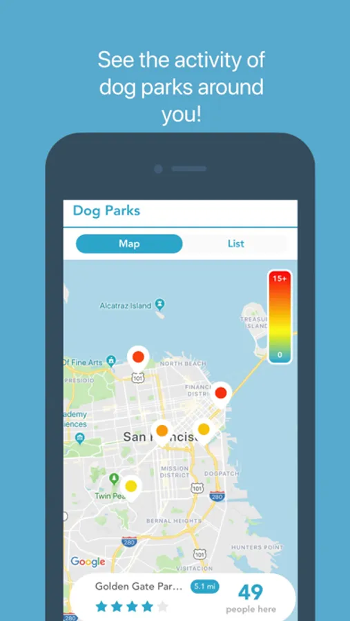 See who is at dog park before you go- Now you can finally see the attendance at the dog park before you decide to go. Users can check into dog parks! This allows people to see which dogs are there before they go, and the profiles of other dog owners who frequent the park.