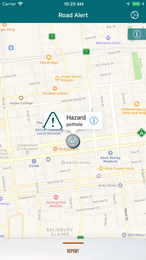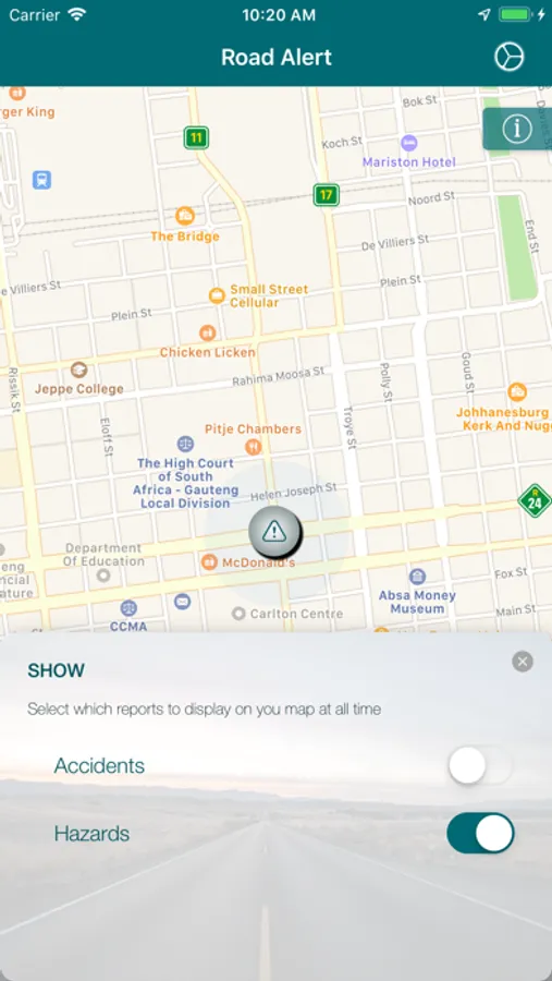 Road-Alert is an driver awareness mobile application aimed at assisting drivers on the road. Road alert makes use of the drivers location to inform them of any zones, areas or sections in the road that have been deemed dangerous or hazardous and require drivers to proceed with extreme caution. Such areas can be construction sites, broken bridge, animals crossing, road accidents etc. Road-Alert makes use of the drivers location while on the road to alert them via notifications, sounds or to preview the journey beforehand to see of any hazards on the road.