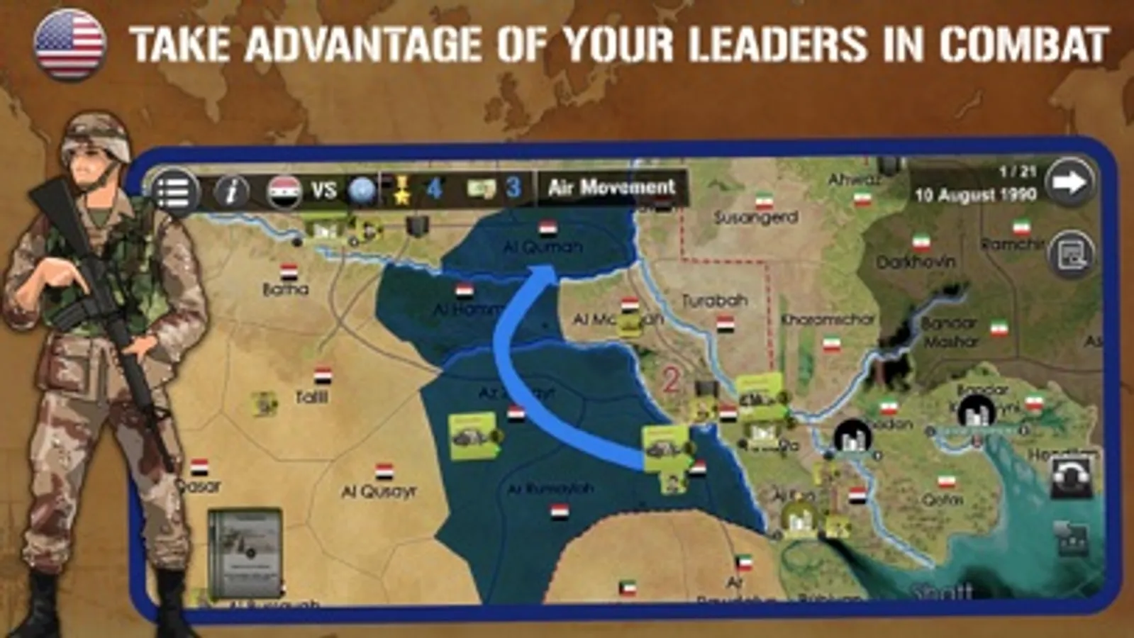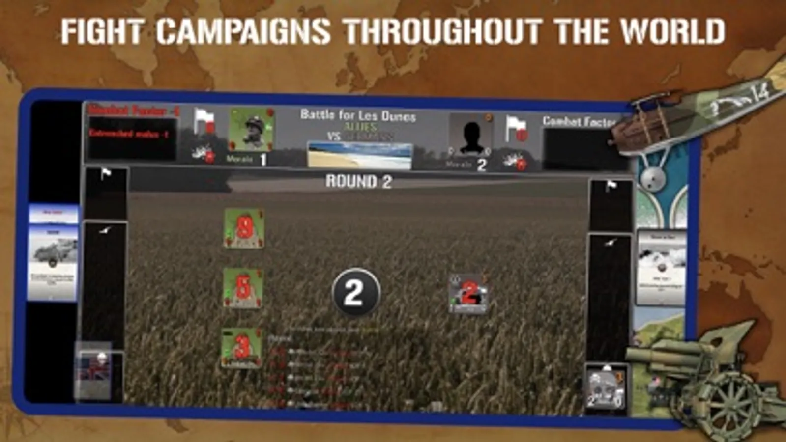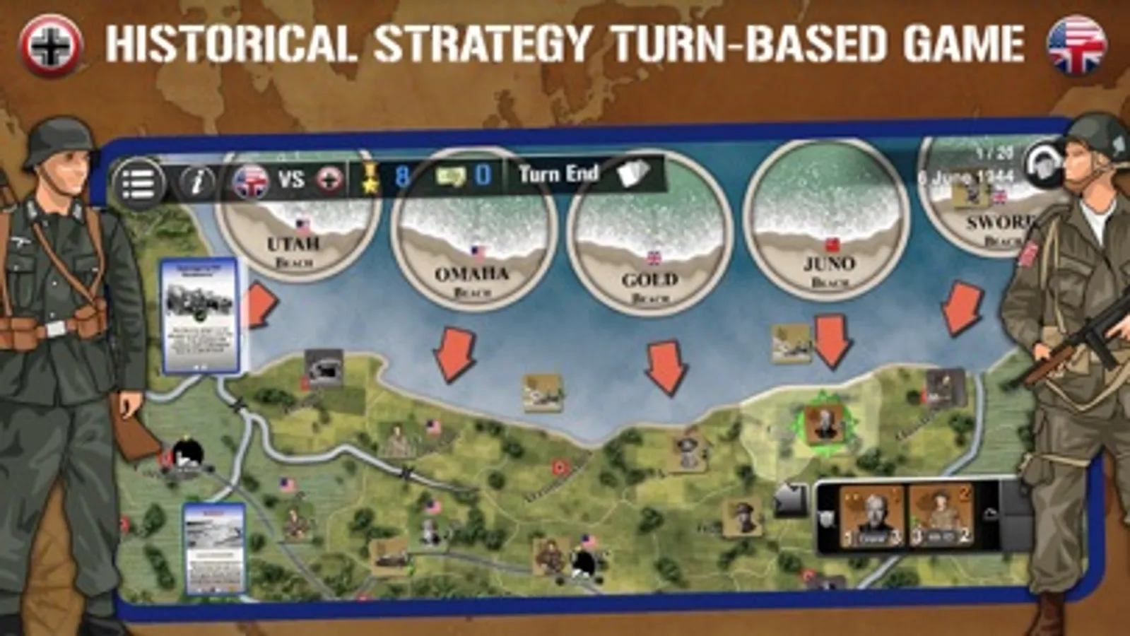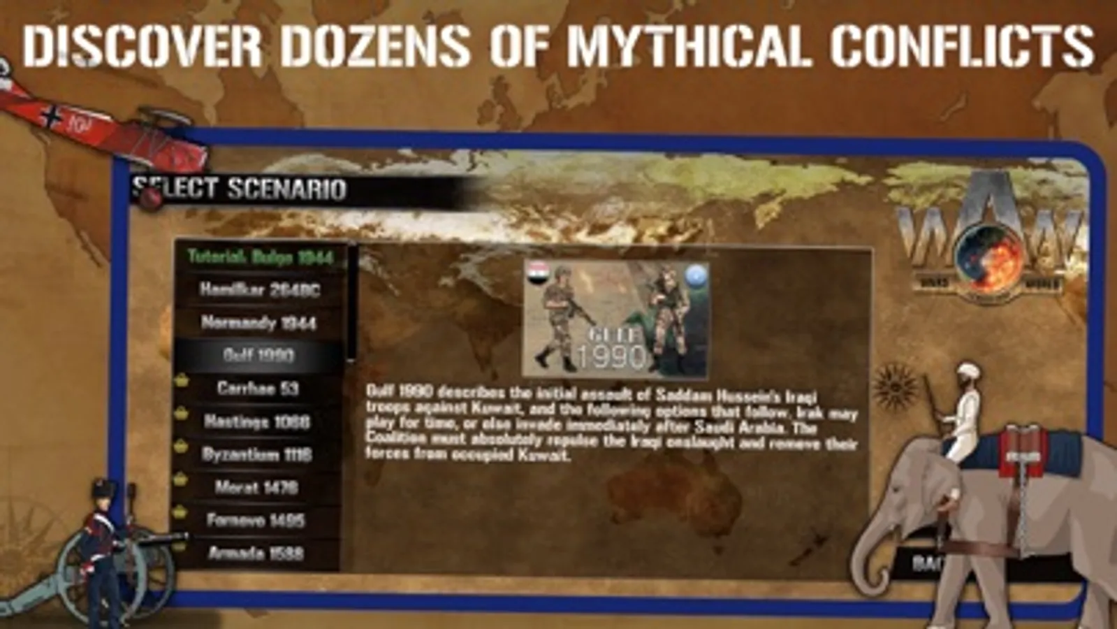 The application contains the scenario Normandy 1944. Several other scenarios are purchasable in content inApp, including: Hamilkar 264 (First Punic War), Hastings 1066 (Conquest of England), Saratoga 1777 (American War of Independence), Waterloo 1815 (Napoleonic wars), Bull Run 1861 and Missouri 1861 (Civil War), Tannenberg 1914 (World War I), Malaya 1941 (WW2 Malaysian campaign), Bulge 1944 (WW2 Battle of the Bulge), Berlin 1945 (End of World War II) ) and Six Days 1967 (Six Day War).