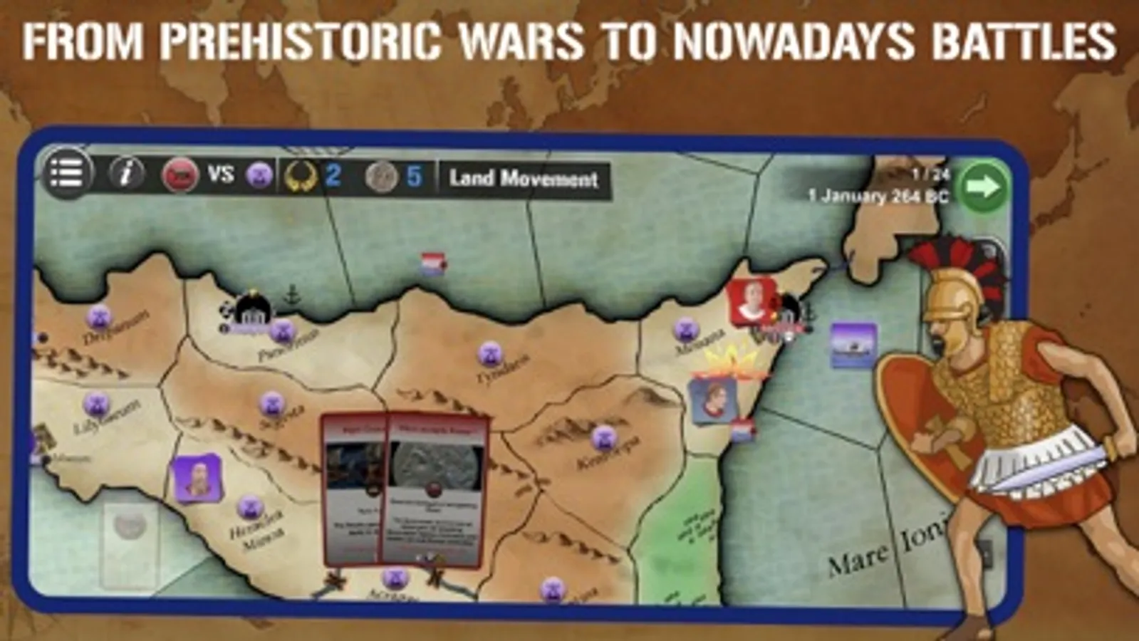 • Combat units may be from the land, naval or air domains. You will find different types, such as infantry, cavalry, artillery, guerrillas, submarines, flat tops, fighters, elephants, anti-aircraft batteries, etc ... All of which can be combined into different stacks for easy handling.
