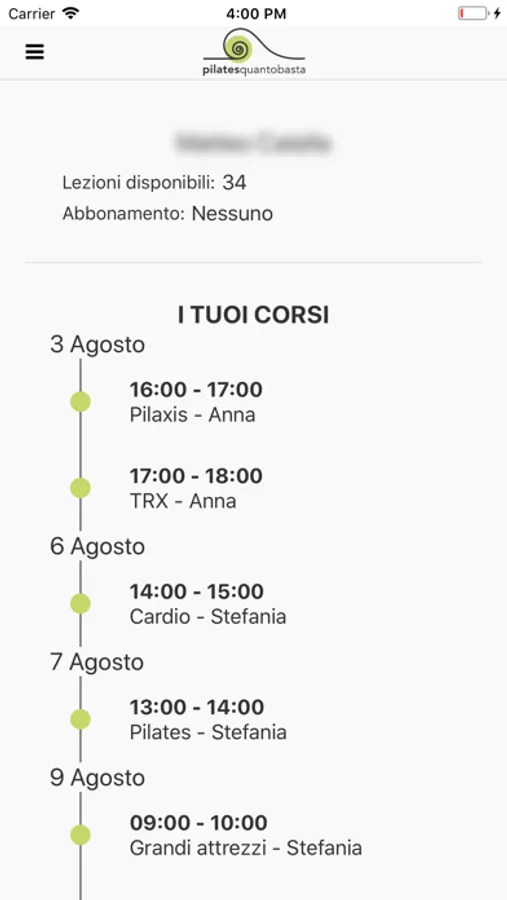 Successivamente nel tuo profilo puoi visualizzare tutti i tuoi dati, relativi a lezioni disponibili e abbonamenti attivi, e un'agenda di tutti corsi a cui ti sei iscritto.