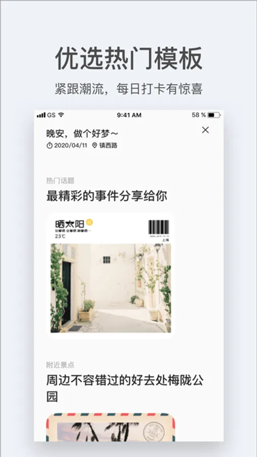 今日推荐、节日节气、加班、旅行、划重点、记录天气这一刻、记录美食地、自制个性头条。每一个“戏精”场景都为您智能标注时间、地点和箴言。