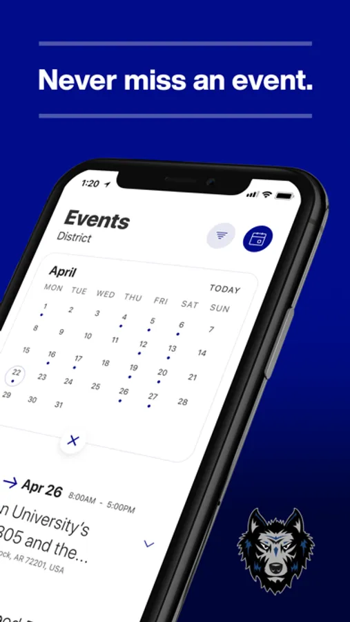 The event section shows a list of events throughout the district. Users can add an event to your calendar to share the event with friends and family with one tap.
