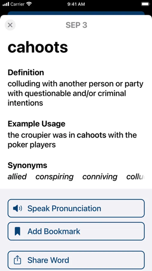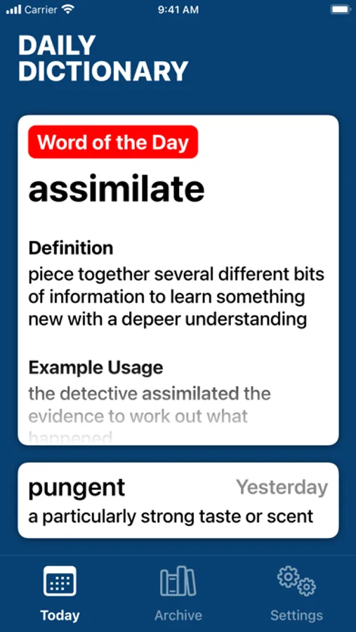 Daily Dictionary features daily notifications, home screen widgets and Siri integration. Word of the day your way. Siri Shortcuts lets you ask Siri ‘word of the day’ from anywhere, and display the daily word and definition inline to Siri.