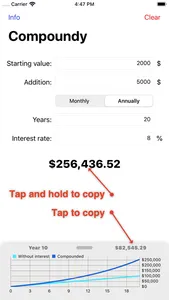 Want to quickly calculate compound? This is the best app to do so. With a simple and intuitive interface it's incredibly easy to enter the data. Then you can see it visualized on a chart - updated live.