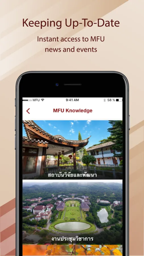 The application allows you to connect with the university anywhere anytime enabling you to stay up-to-date on any Mae Fah Luang news and events and instantly allows you to access any required Mae Fah Luang services on-the-go.