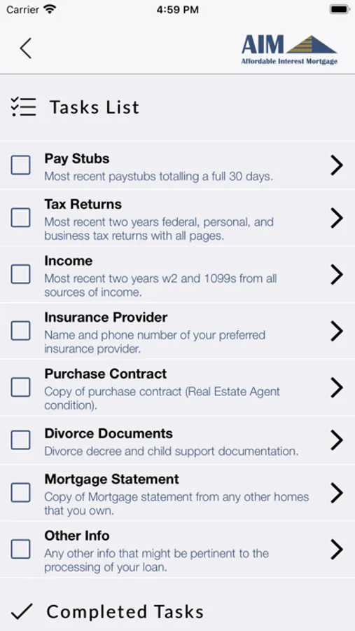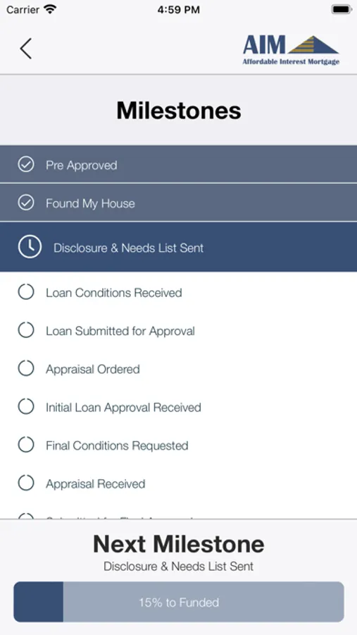 The TAKE AIM Mortgage app allows all 3 parties (home buyer, loan officer, real estate agent) to track the progress of the home loan application process as the Home Buyer meets the milestones and conditions required to get final approval.