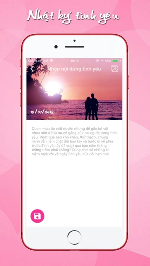 - Nhật ký tình yêu: ghi lại kỷ niệm tình yêu, những khoảnh khắc yêu nhau, những giây phút tuyệt vời ở bên nhau của cặp đôi. Bạn có thể dễ dàng thêm, xoá, chỉnh sửa các kỷ niệm tình yêu này ở trong ứng dụng.