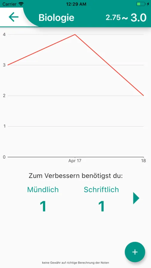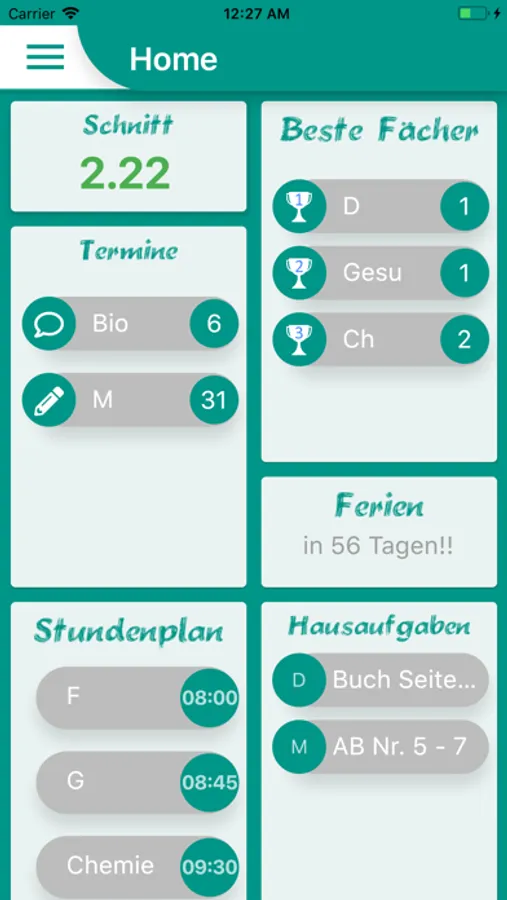 Noten: Calimba berechnet dir automatisch für jedes Fach deine Zeugnisnote und zeigt dir, wie sich deine Noten entwickelt haben. Außerdem siehst du auf einen Blick, welche Note du benötigst, um eine bessere Note im Zeugnis zu bekommen, und ob sich z.B. ein freiwilliges Referat am Ende des Schuljahres noch lohnt.